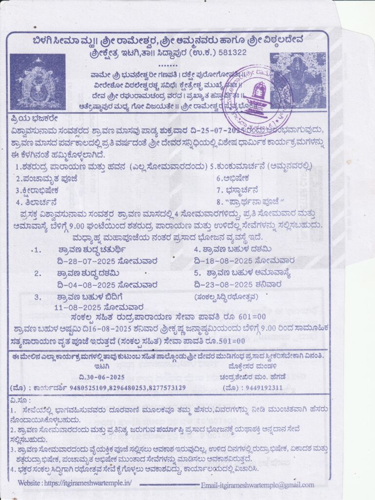 ಶ್ರಾವಣ ಬಹುಳ ಅಷ್ಠಮಿ 16-08-2025 ಶನಿವಾರ ಶ್ರೀಕೃಷ್ಣ ಜನ್ಮಾಷ್ಠಮಿಯಂದು ಬೆಳಿಗ್ಗೆ 9.00 ರಿಂದ ಸಾಮೂಹಿತ ಸತ್ಯನಾರಾಯಣ ಪೂಜೆ ಇರುತ್ತದೆ.(ಸಂಕಲ್ಪ ಸಹಿತ) ಸೇವಾ ಪಾವತಿ ರೂ.501-/