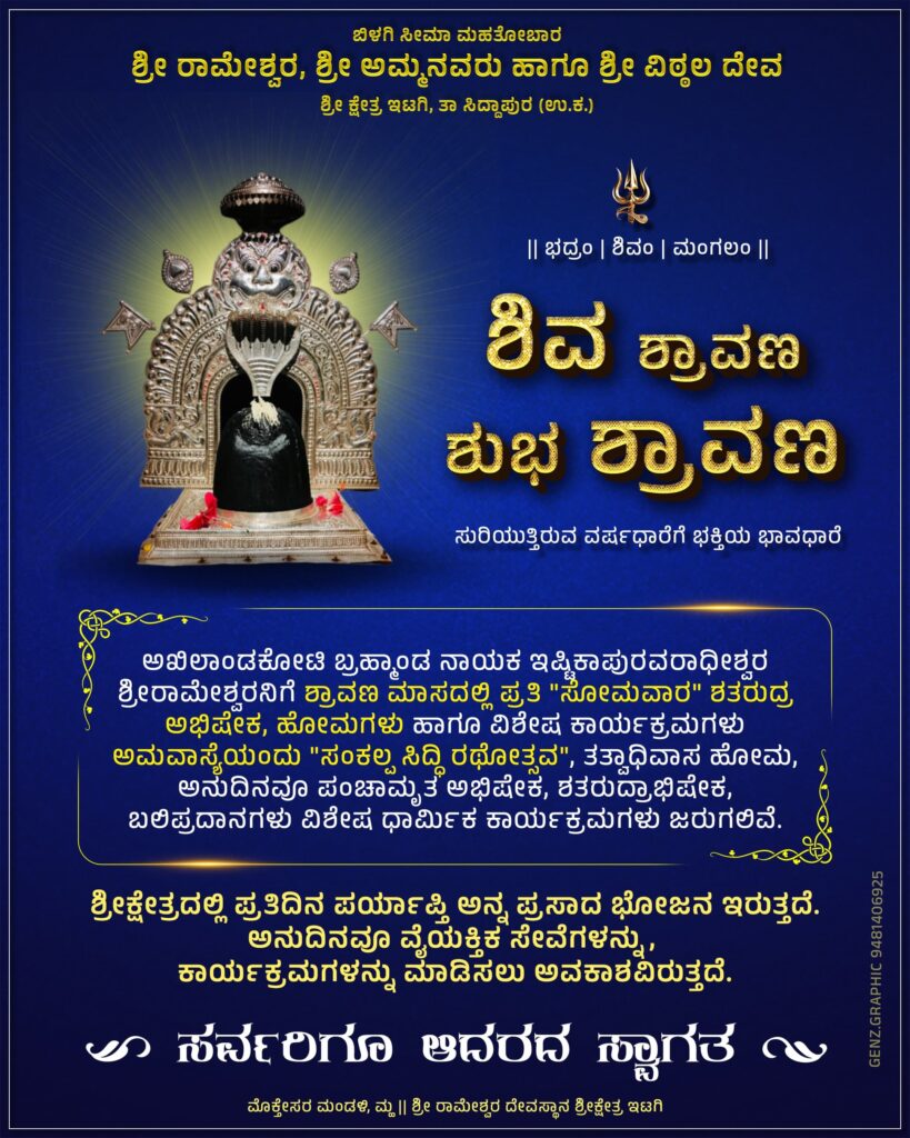 ಸಿದ್ದಾಪುರ ತಾಲ್ಲೂಕಿನ ಶ್ರೀಕ್ಷೇತ್ರ ಇಟಗಿಯ ಶ್ರೀ ರಾಮೇಶ್ವರನ ಸನ್ನಿಧಿಯಲ್ಲಿ ಪ್ರತಿ ವರ್ಷದಂತೆ ಈ ವರ್ಷವೂ ಶ್ರಾವಣ ಮಾಸದ ಆಚರಣೆಯನ್ನು ಧಾರ್ಮಿಕ ಕಾರ್ಯಕ್ರಮಗಳೊಂದಿಗೆ ಆಚರಿಸಲಾಗುವುದು ಎಂದು ಆಡಳಿತ ಮಂಡಳಿ ತಿಳಿಸಿದೆ.