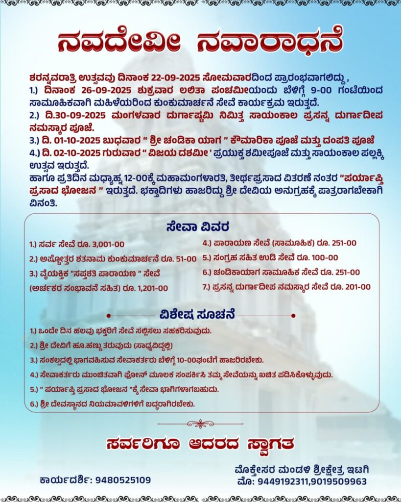 4.) ದಿ. 02-10-2025 ವಿಜಯ ದಶಮೀ ” ಪ್ರಯುಕ್ತ ಶಮಿಪೂಜೆ ಮತ್ತು ಸಾಯಂಕಾಲ ಪಲ್ಲಕ್ಕಿ ಉತ್ಸವ ಇರುತ್ತದೆ.