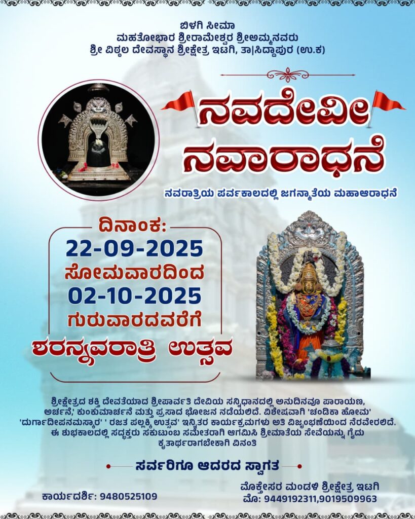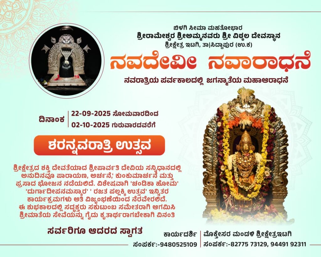 ” ಶರನ್ನವರಾತ್ರಿ ಉತ್ಸವವು “ದಿನಾಂಕ 22-09-2025 ಸೋಮವಾರದಿಂದ ಪ್ರಾರಂಭವಾಗಲಿದ್ದು.