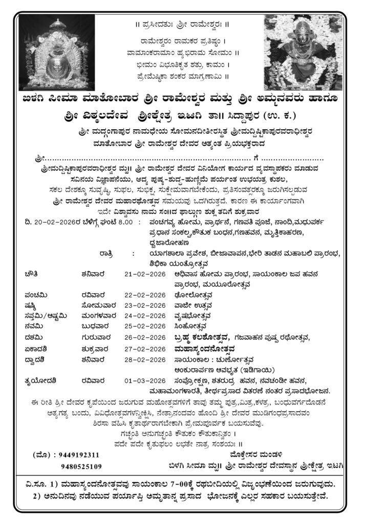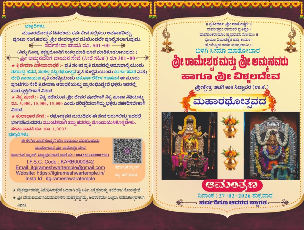 ಶ್ರೀಕ್ಷೇತ್ರದ ತೇರಿನ ರಾಯಸ ಆಮಂತ್ರಣ https://itgirameshwartemple.in/%e0%b2%b6%e0%b3%8d%e0%b2%b0%e0%b3%80%e0%b2%95%e0%b3%8d%e0%b2%b7%e0%b3%87%e0%b2%a4%e0%b3%8d%e0%b2%b0-%e0%b2%a4%e0%b3%87%e0%b2%b0%e0%b2%bf%e0%b2%a8-%e0%b2%b0%e0%b2%be%e0%b2%af%e0%b2%b8-%e0%b2%86/ https://itgirameshwartemple.in/%e0%b2%b6%e0%b3%8d%e0%b2%b0%e0%b3%80%e0%b2%95%e0%b3%8d%e0%b2%b7%e0%b3%87%e0%b2%a4%e0%b3%8d%e0%b2%b0-%e0%b2%a4%e0%b3%87%e0%b2%b0%e0%b2%bf%e0%b2%a8-%e0%b2%b0%e0%b2%be%e0%b2%af%e0%b2%b8-%e0%b2%86/#respond Mon, 22 Dec 2025 05:46:40 +0000 https://itgirameshwartemple.in/?p=2640 ಬಿಳಸೀಮಾ ಒಡೆಯ ಶ್ರೀ ರಾಮೇಶ್ವರ ಮತ್ತು ಶ್ರೀ ಅಮ್ಮನವರು ಹಾಗೂ ಶ್ರೀ ವಿಠ್ಠಲ ದೇವಸ್ಥಾನ ಶ್ರೀಕ್ಷೇತ್ರ ಇಟಗಿಯಲ್ಲಿ ಪ್ರತಿ ವರುಷದಂತೆ ನೆರವೇರುವ ಶ್ರೀ ರಾಮೇಶ್ವರನ ರಥೋತ್ಸವದ ರಾಯಸ ಆಮಂತ್ರಣ.